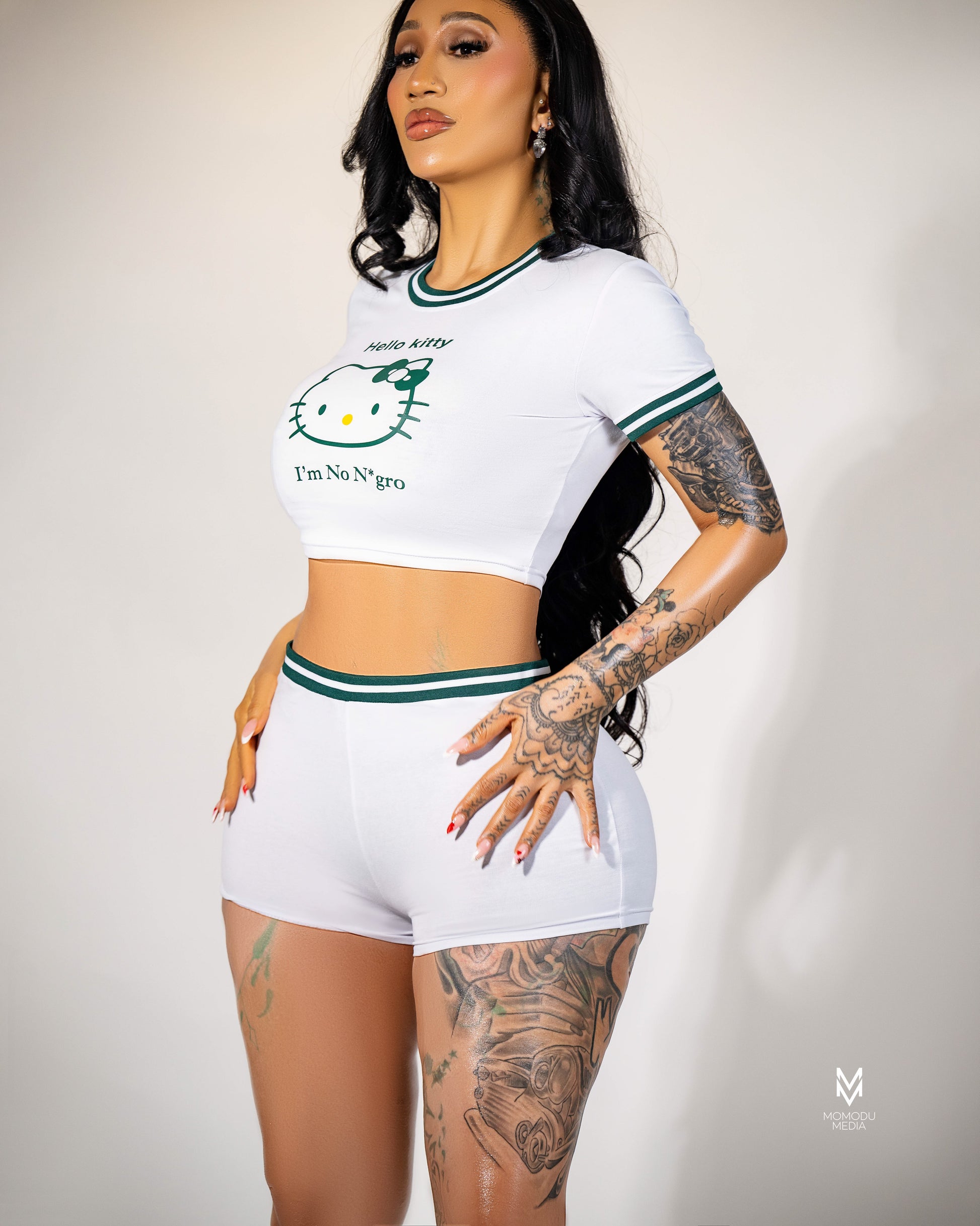 The White Noise set pairs a cropped tee and high-rise shorts in crisp white with bold green piping for a sporty-luxe edge. The statement graphic adds a unique, conversation-starting twist that makes this set impossible to ignore.
